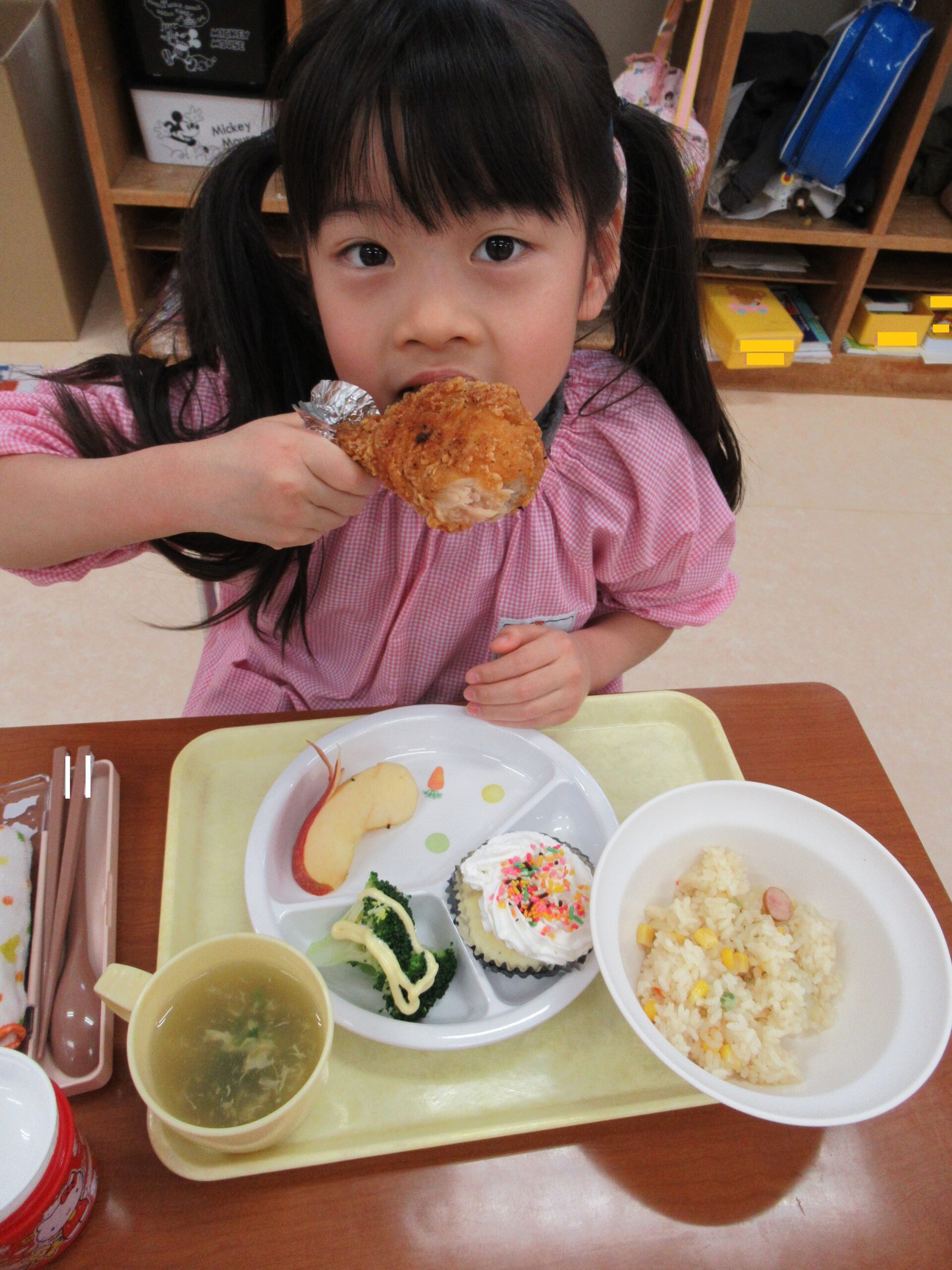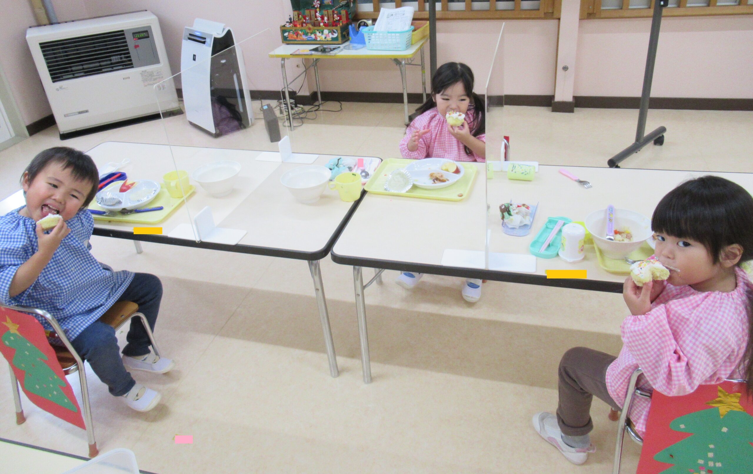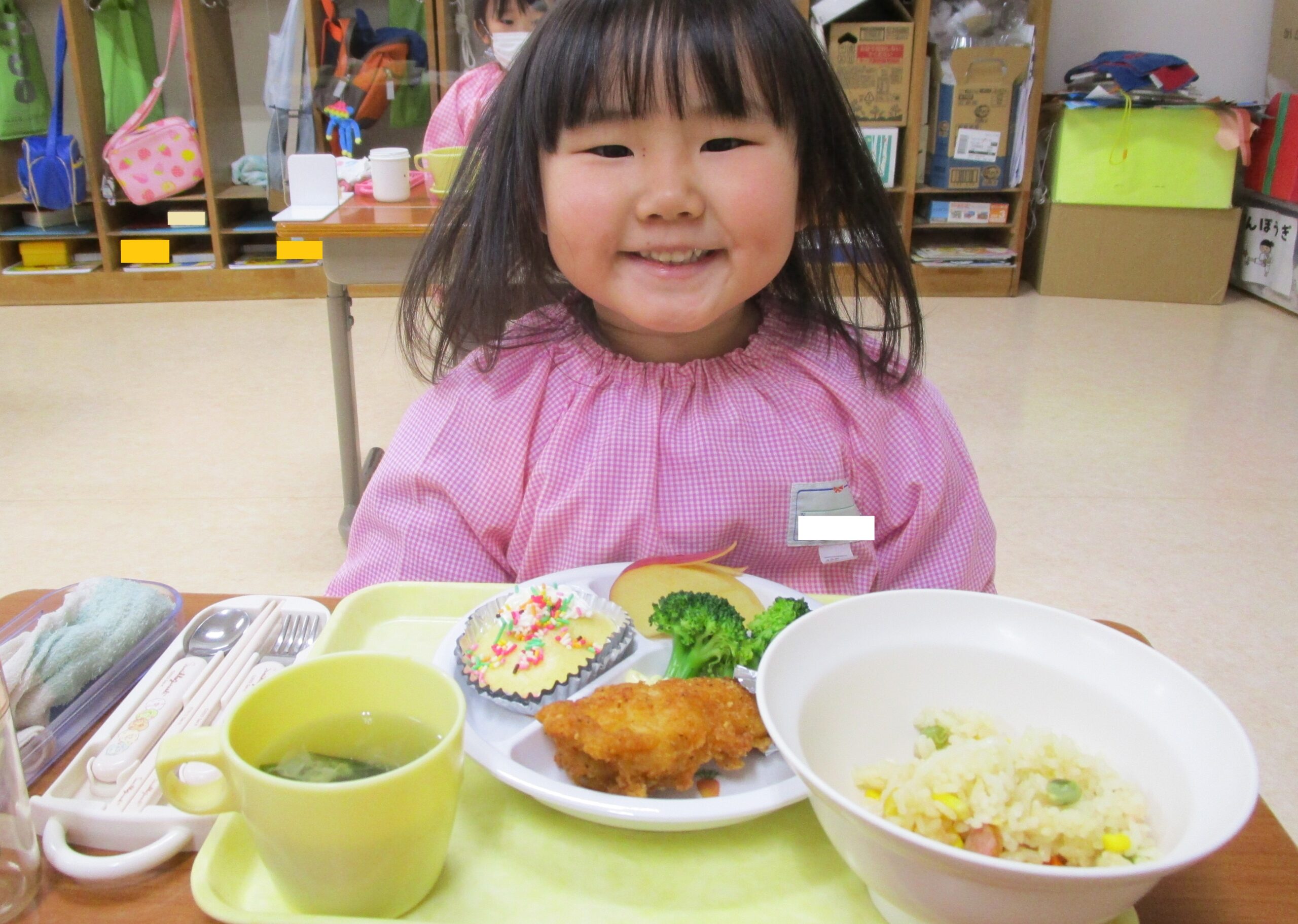自分でデコレーションした蒸しパンとクリスマスメニューに大満足の笑顔😊