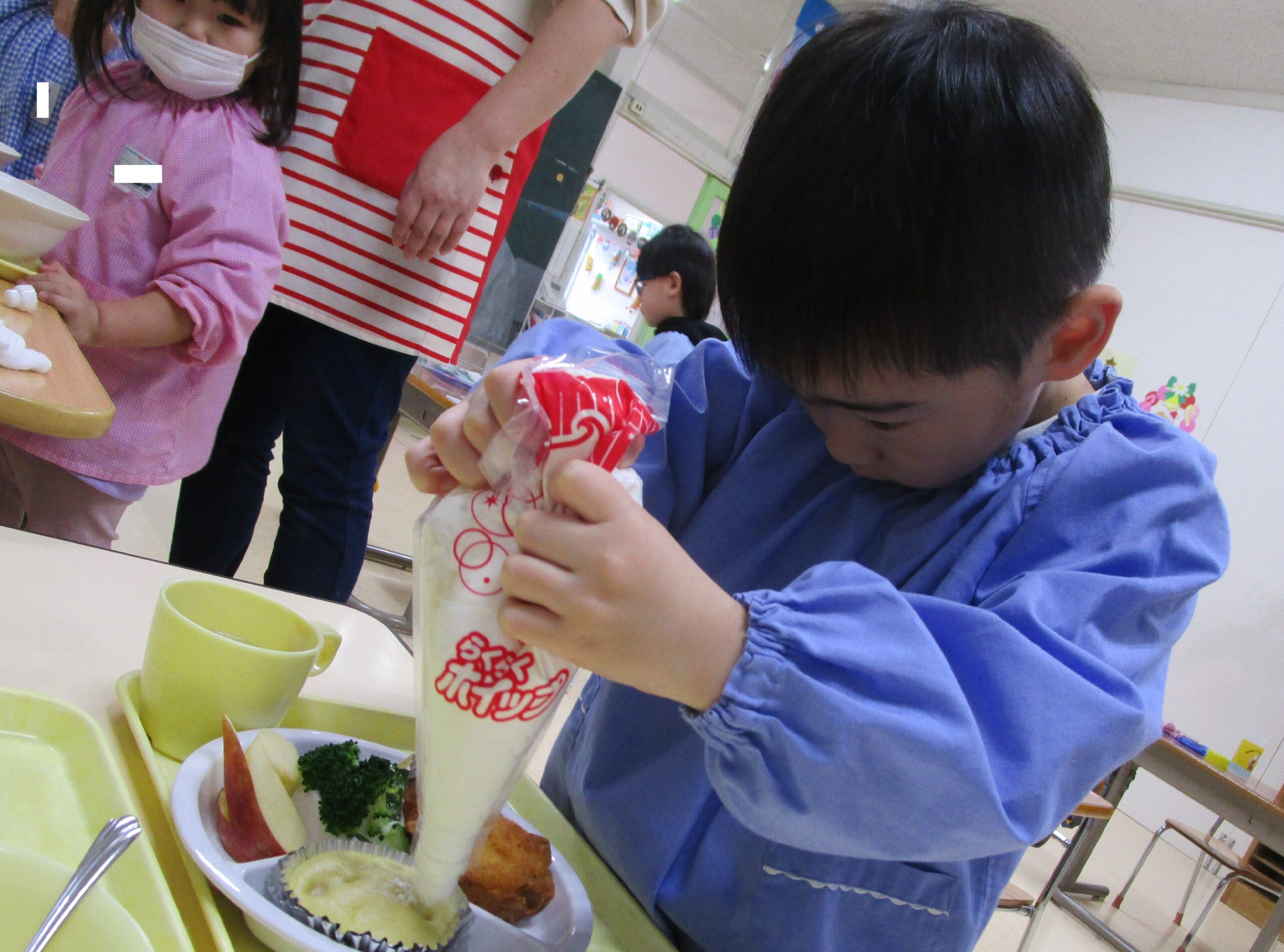 給食先生の手作りデザート「りんごの蒸しパン」に、子ども達が生クリームとチョコスプレーでデコレーションしました。デコレーションするときの表情は真剣そのもの✨