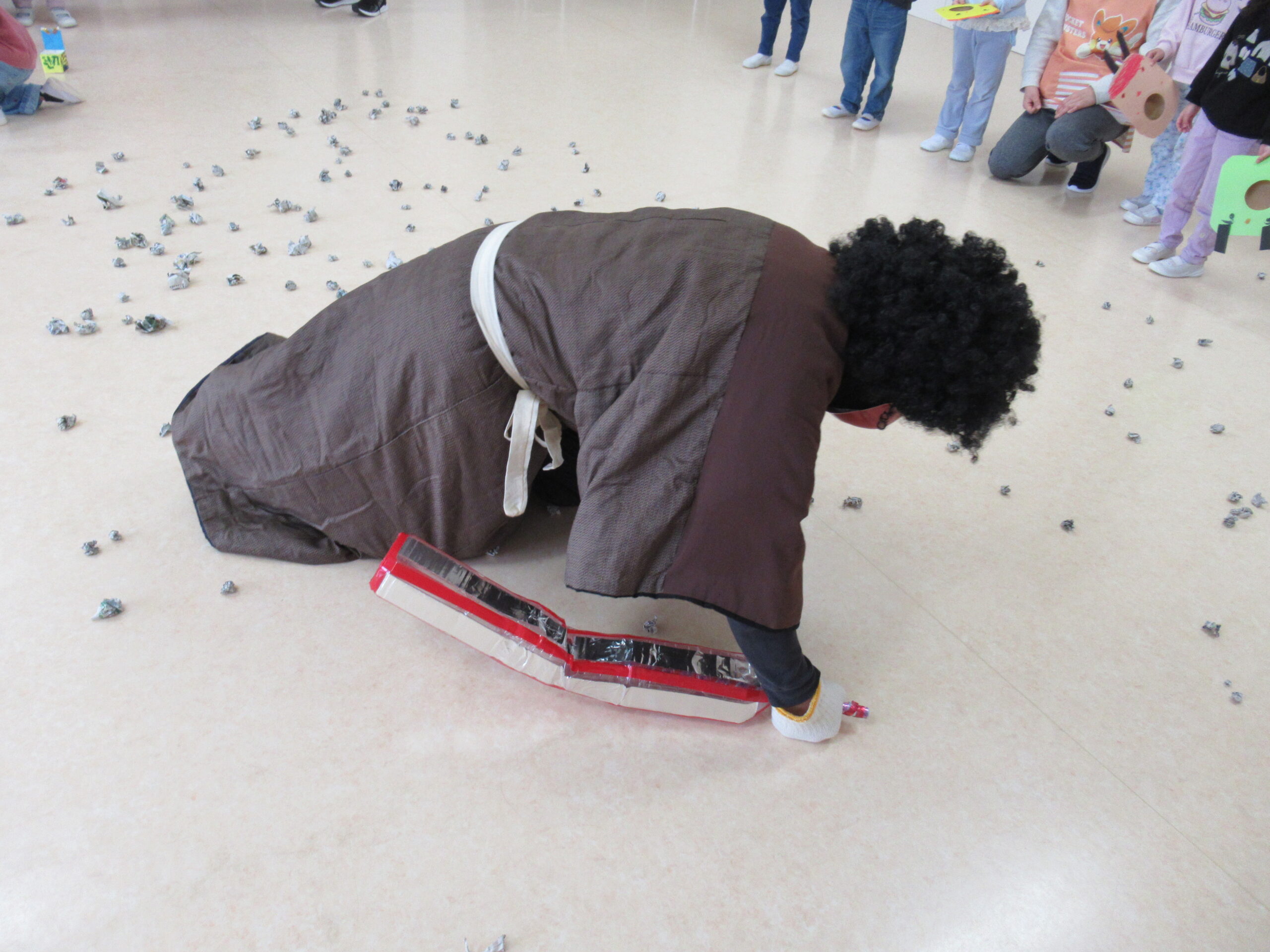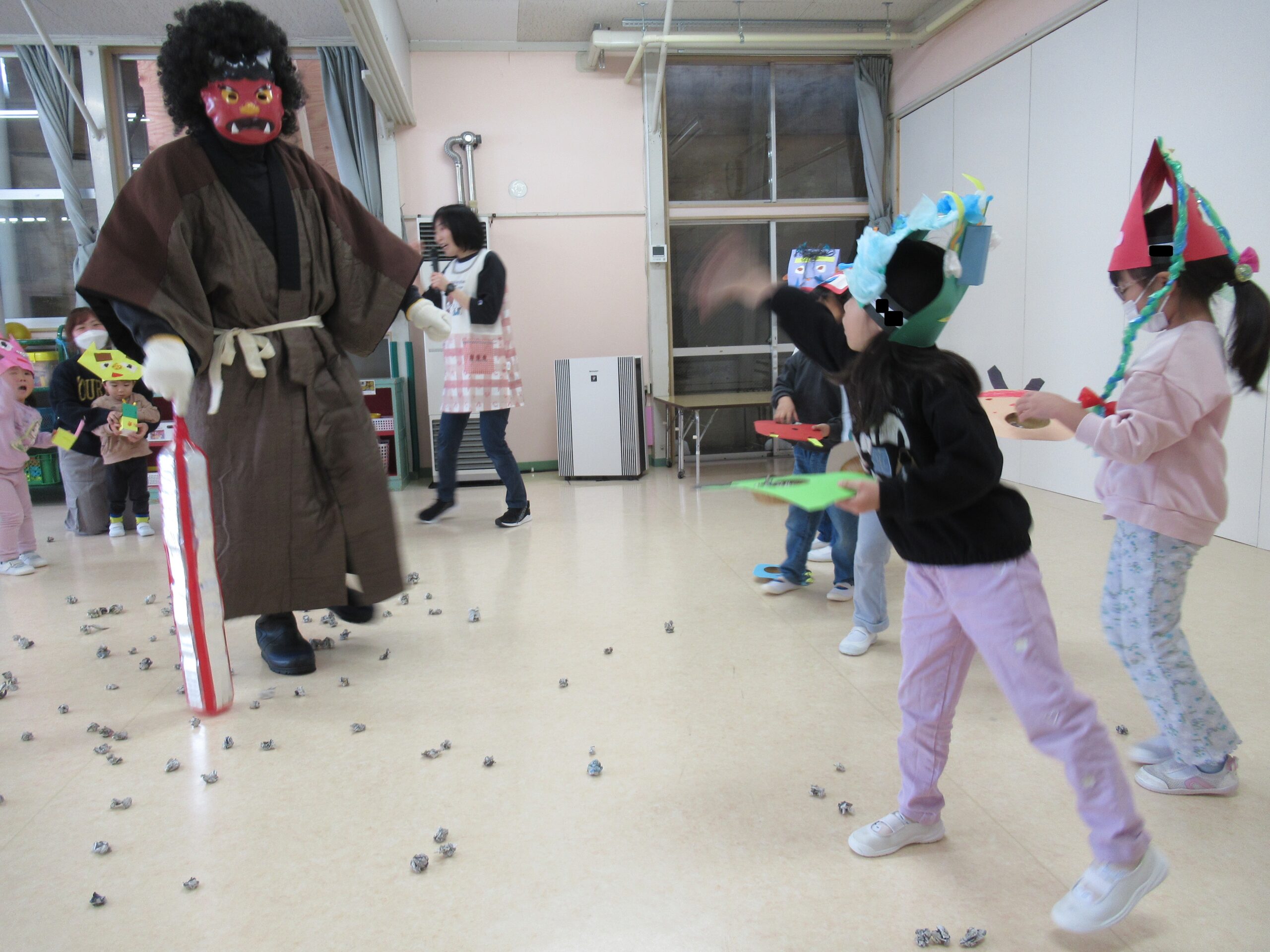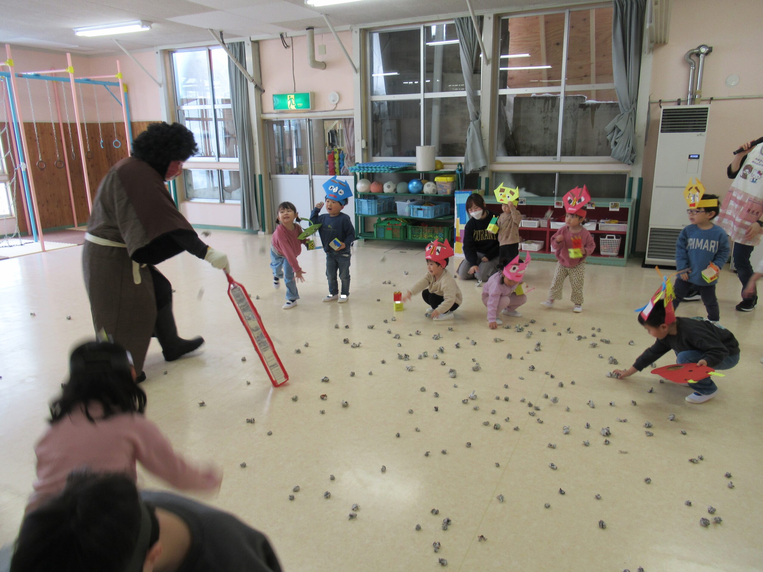 ドスンドスンと足音をたてて赤鬼が登場すると、子ども達は一斉に豆(新聞紙を丸めたもの)をオニに投げつけました 「おには~そと」「ふくは~うち」