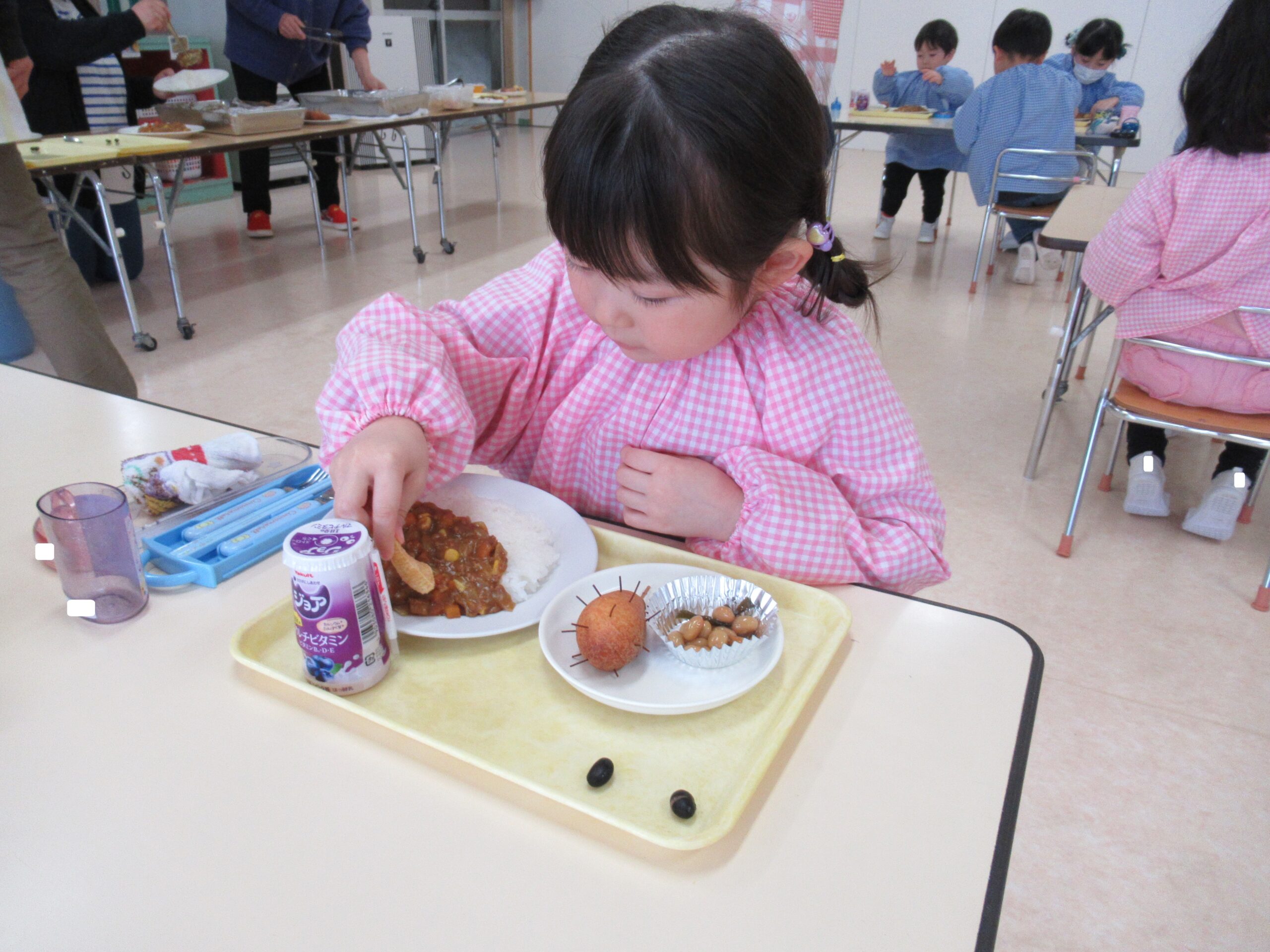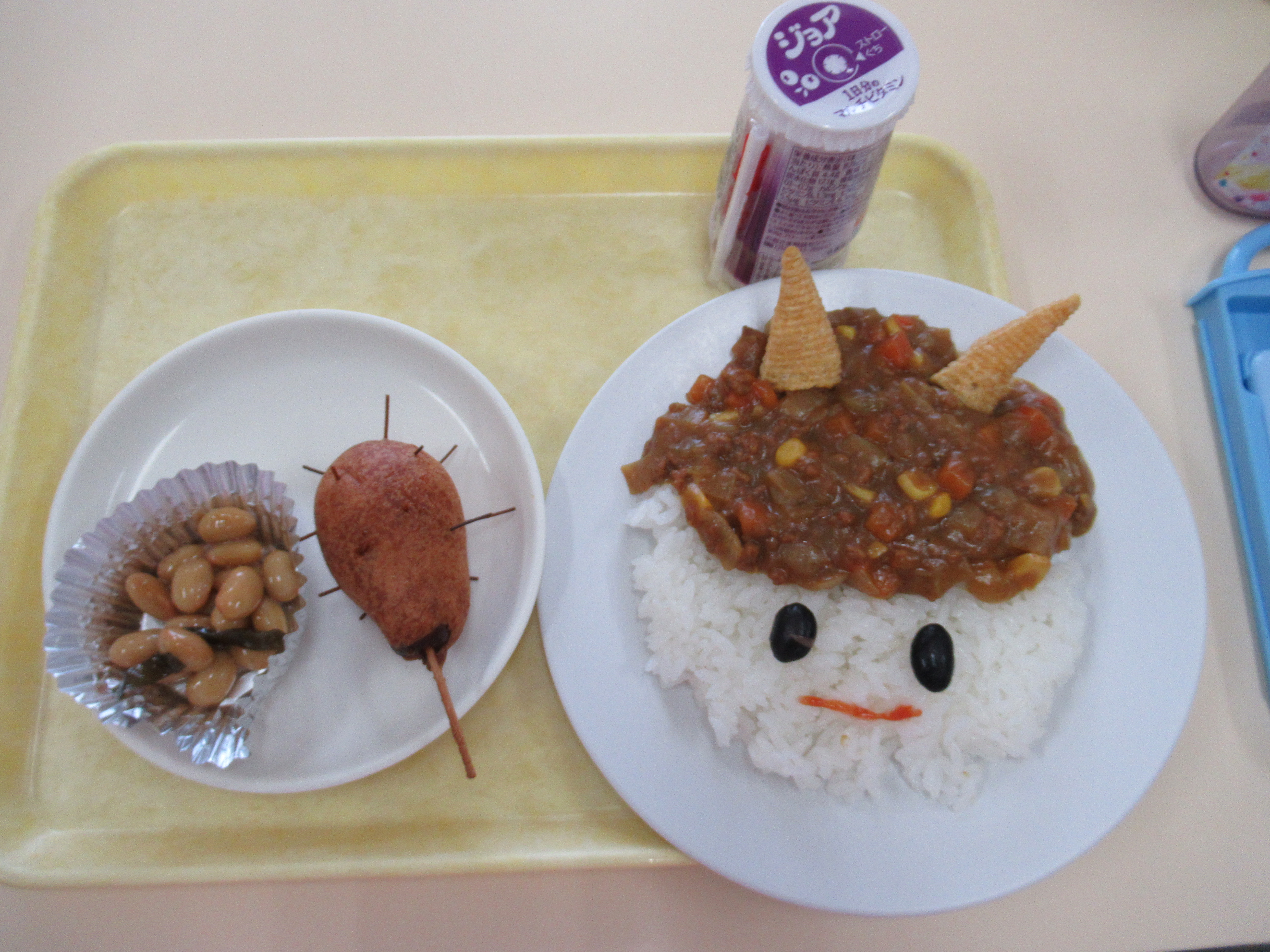今日の給食は オニのキーマカレーとミニかなぼうです!