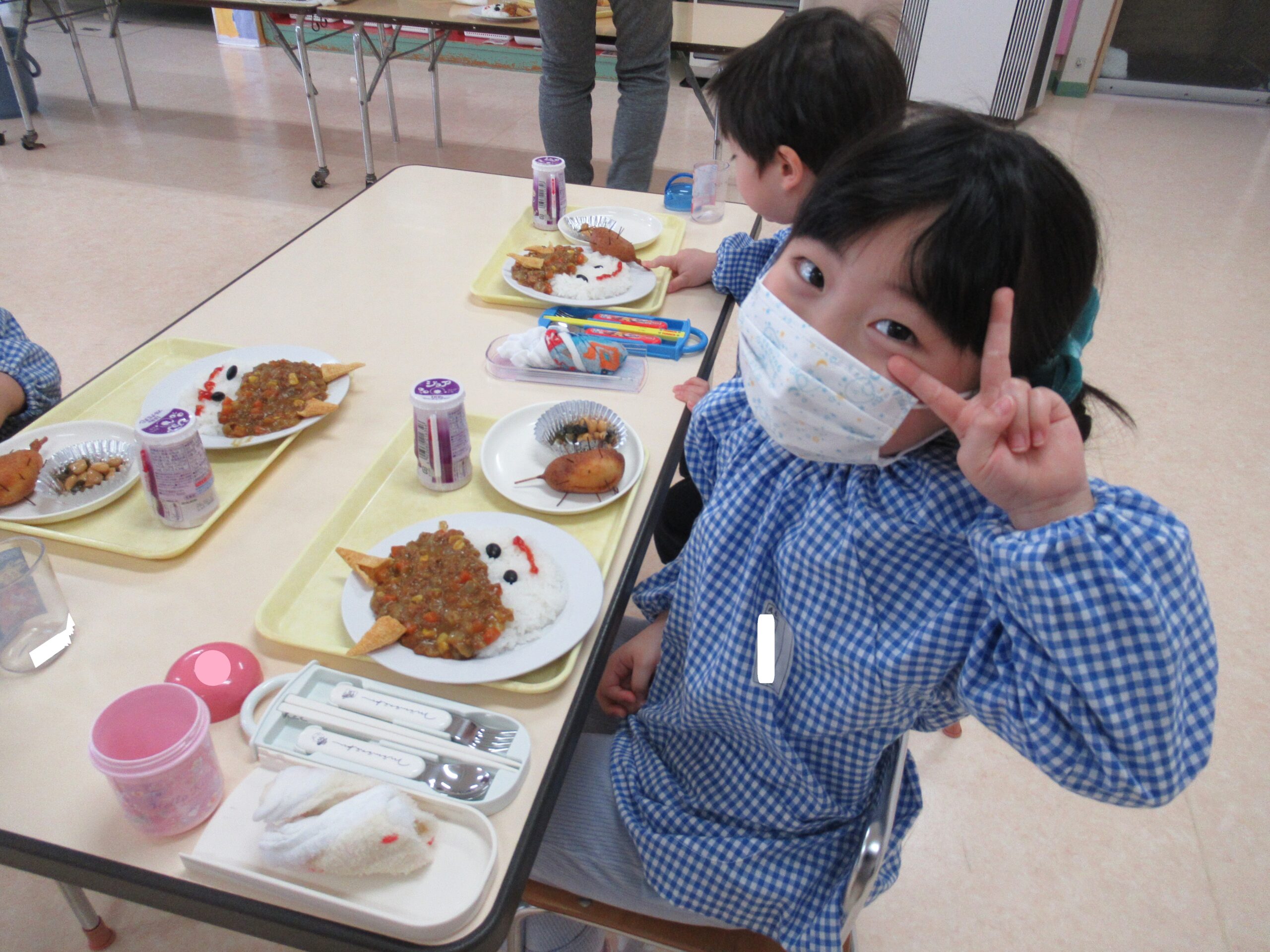 つのはとんがりコーンで、目は黒豆、口はケチャップで、子ども達がデコレーションして、みんなで一緒に食べました。