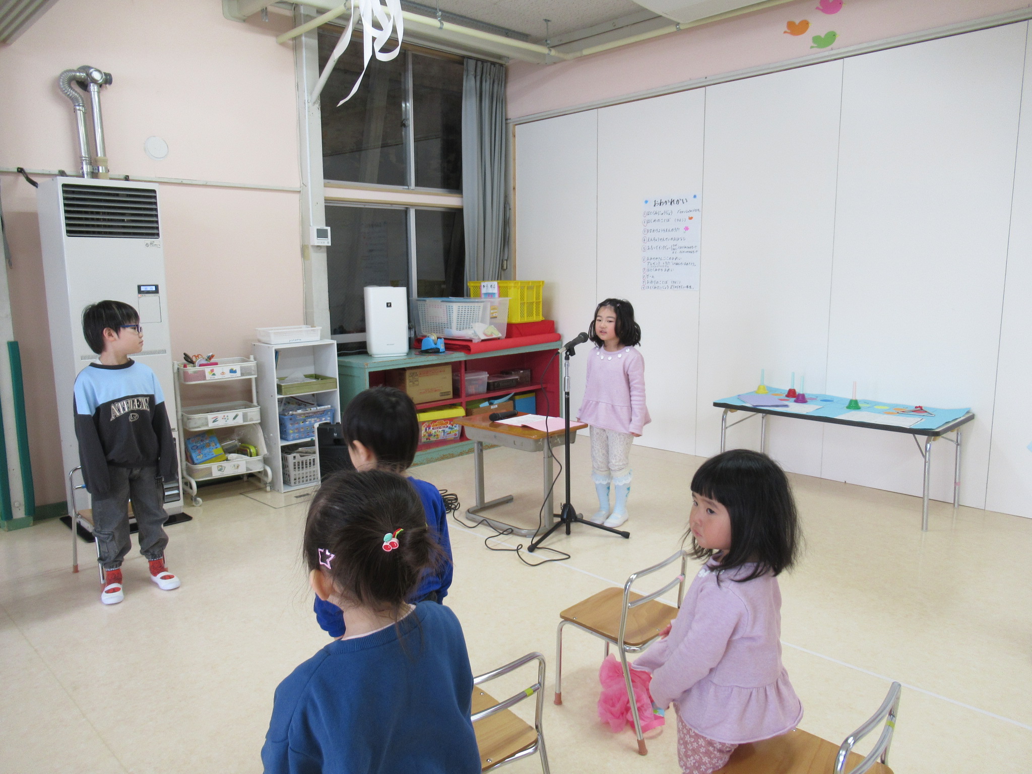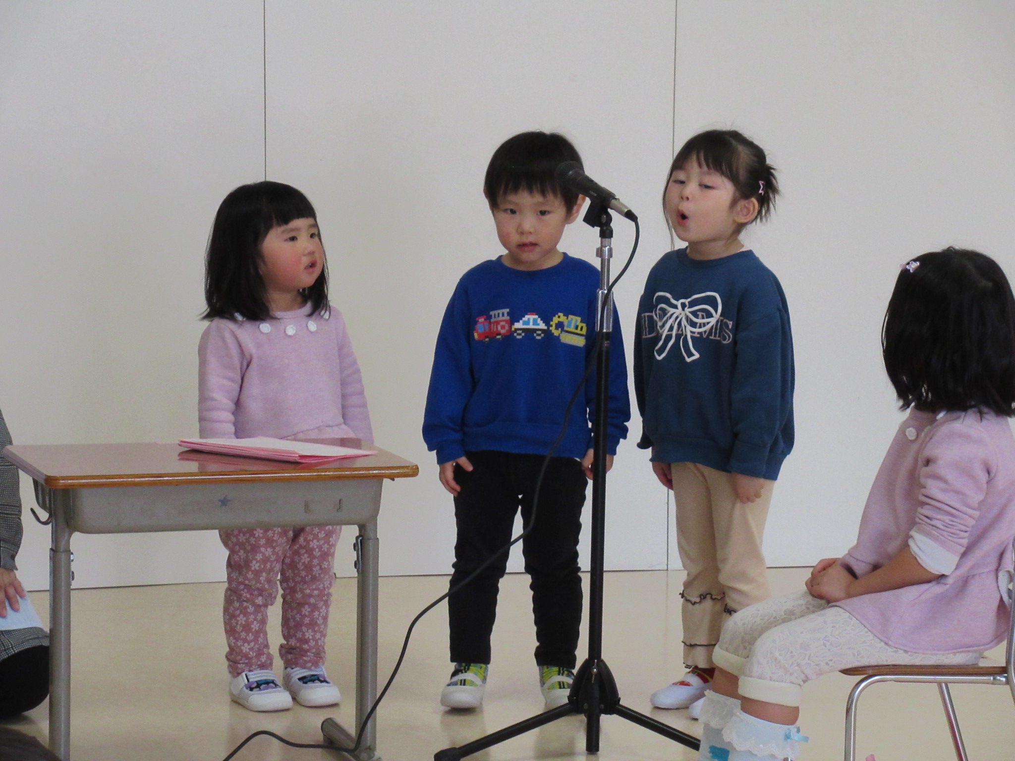 まずは幼稚園で楽しかったこと、はと組さんとの思い出発表です。