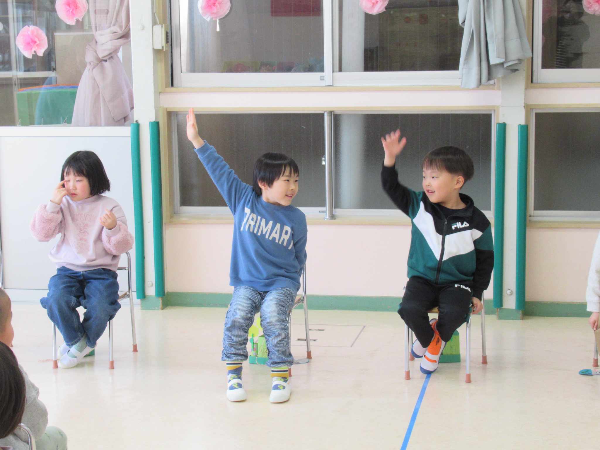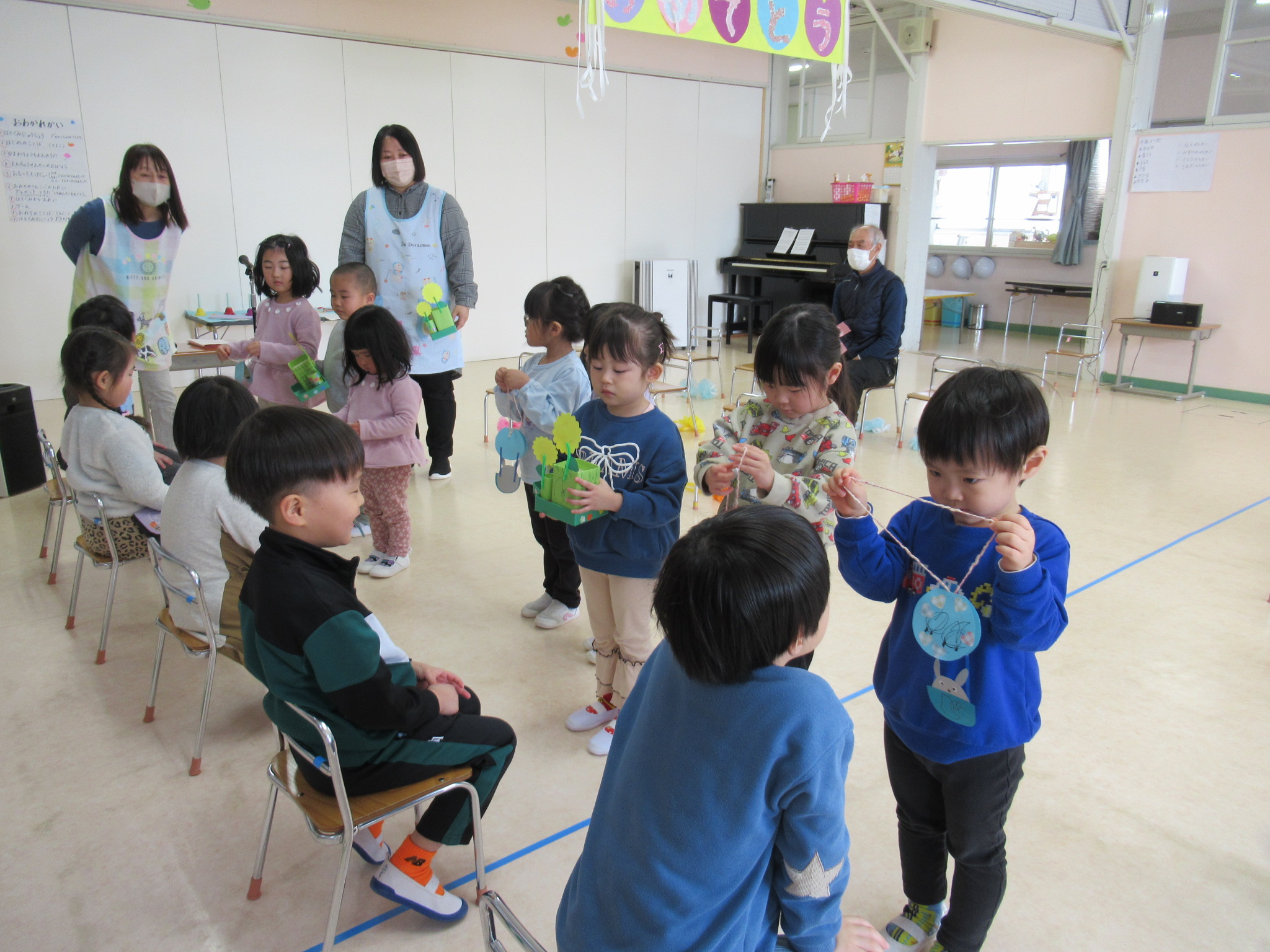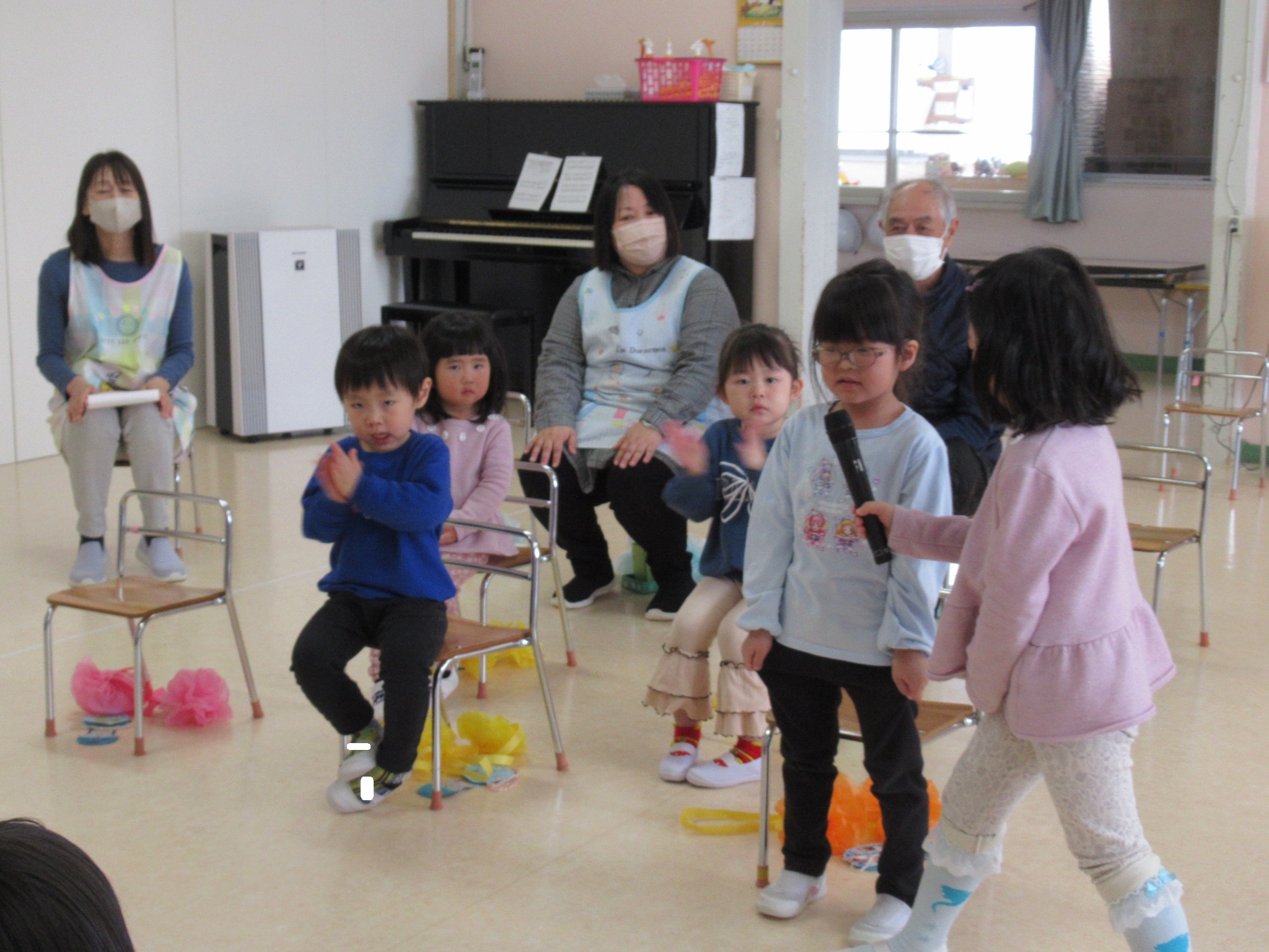 計画や当日の司会進行はうさぎ組さんが担当しましたよ。司会の練習やゲームなどの準備、会場の飾りつけなどを毎日少しずつ頑張っていました。会場の飾りつけはひよこ組さんもお手伝いをして、協力しながら当日を迎えました。