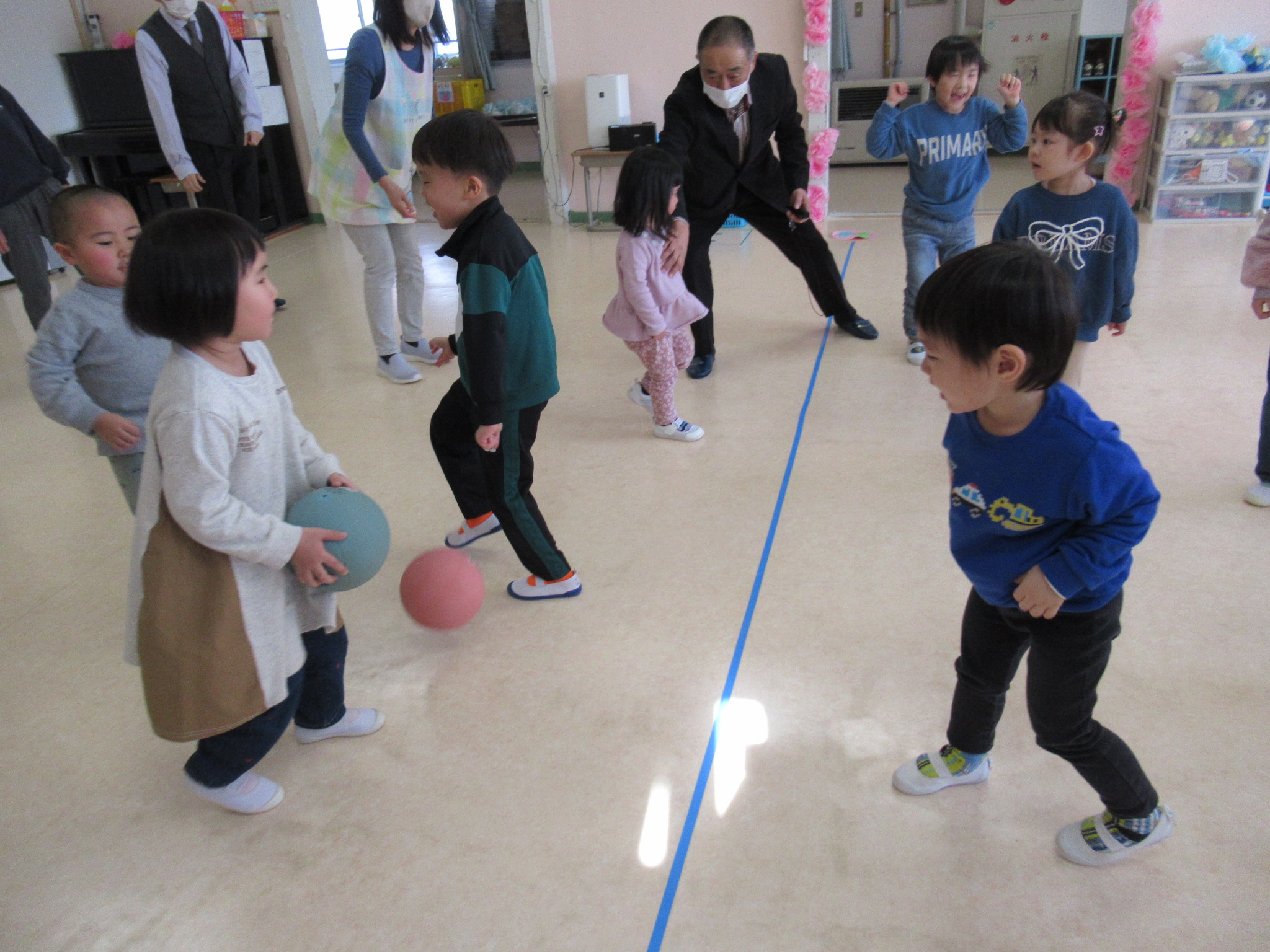 講師の先生たちと一緒にクイズや転がしドッヂボールをして大盛り上がり!! ドッヂボールの審判は少林寺拳法の先生が担当してくれました。