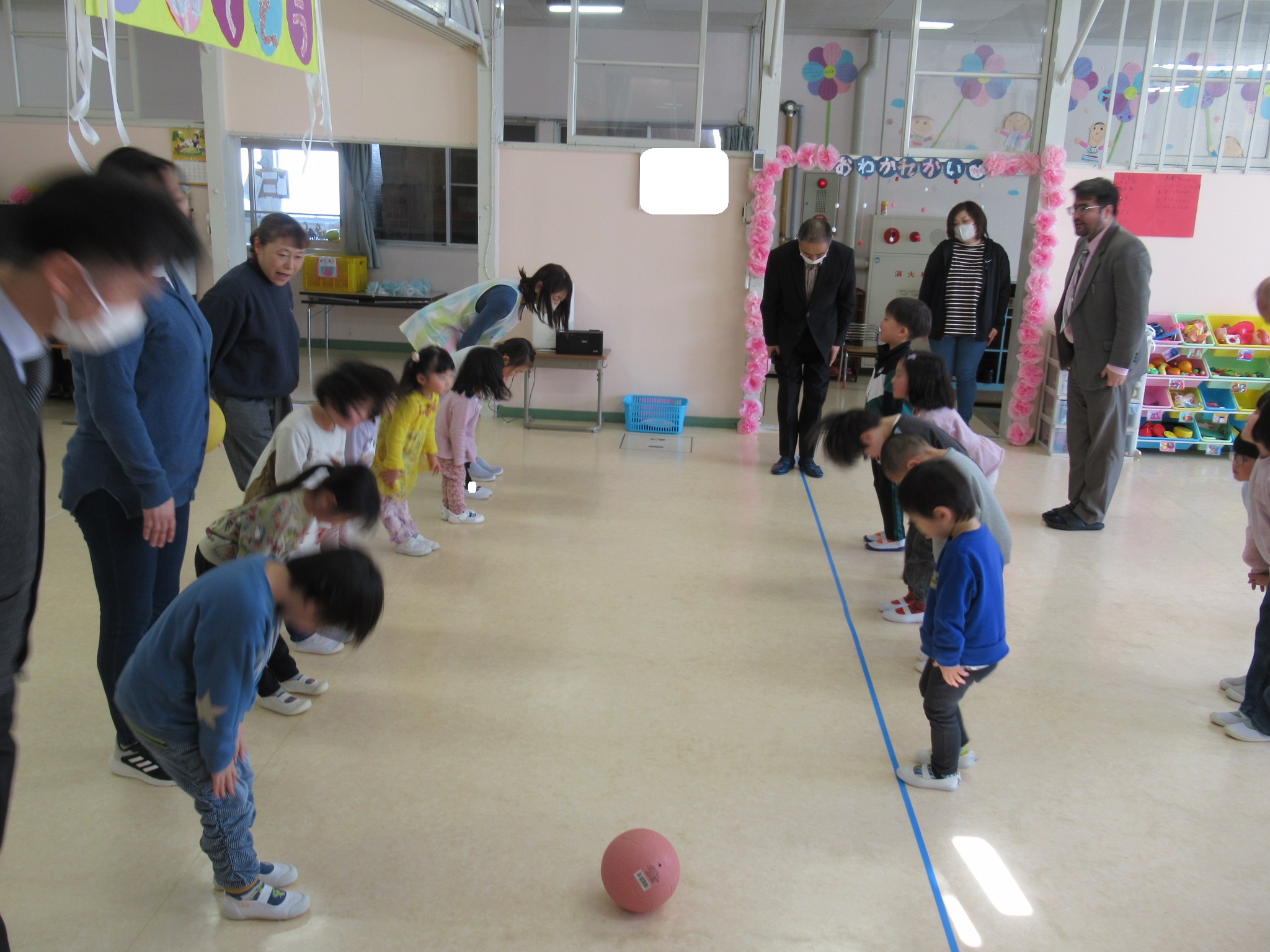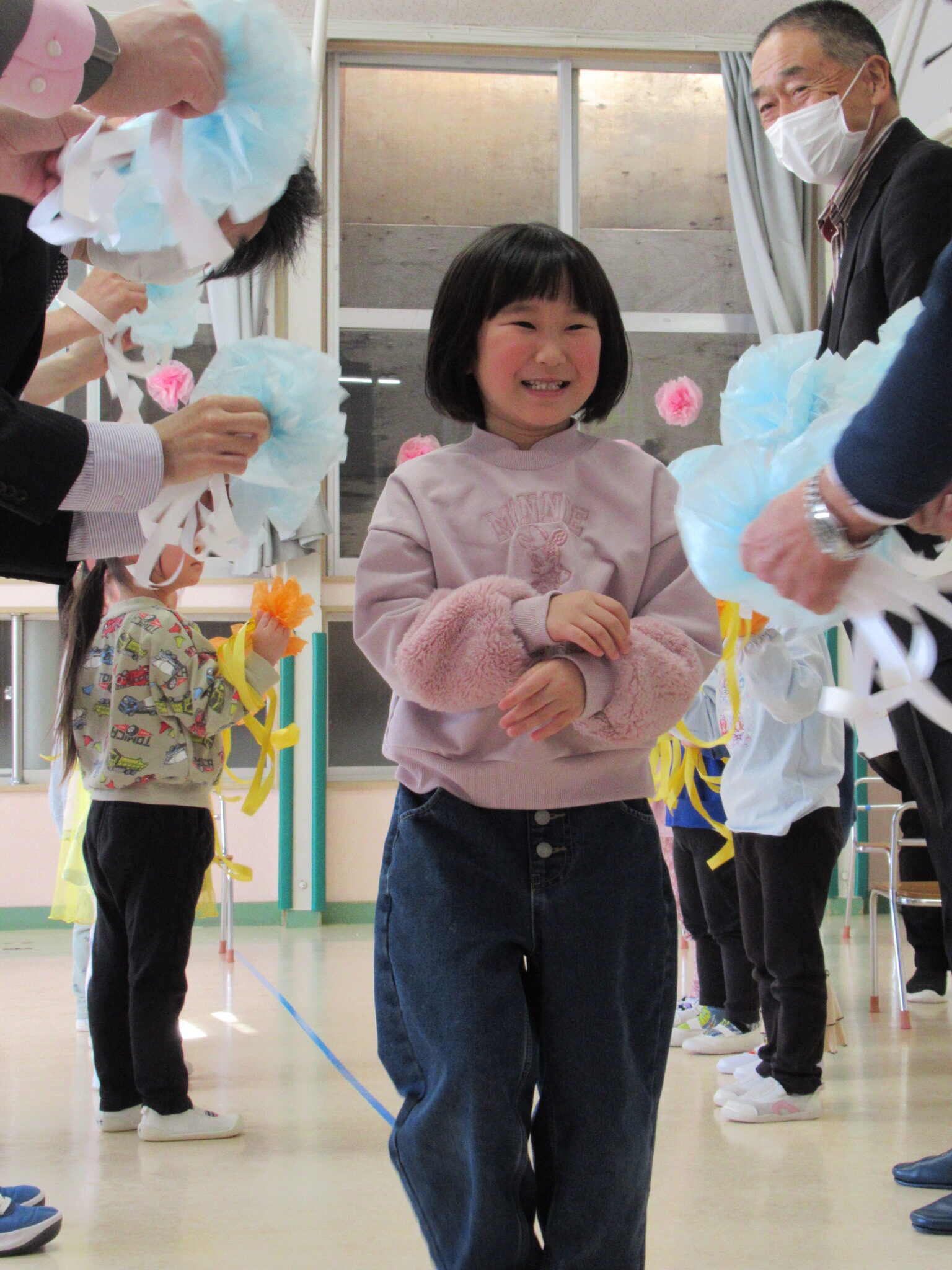 最後はお花のアーチをくぐってはと組さんが退場です。少しはずかしそうにしながら元気に行進をしていました。