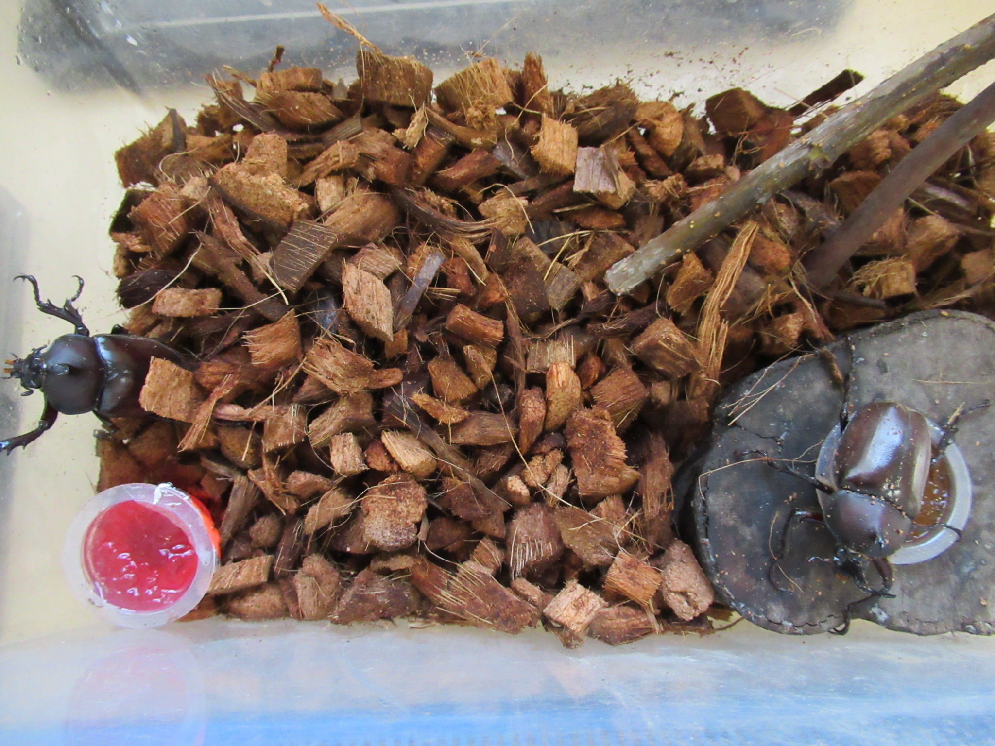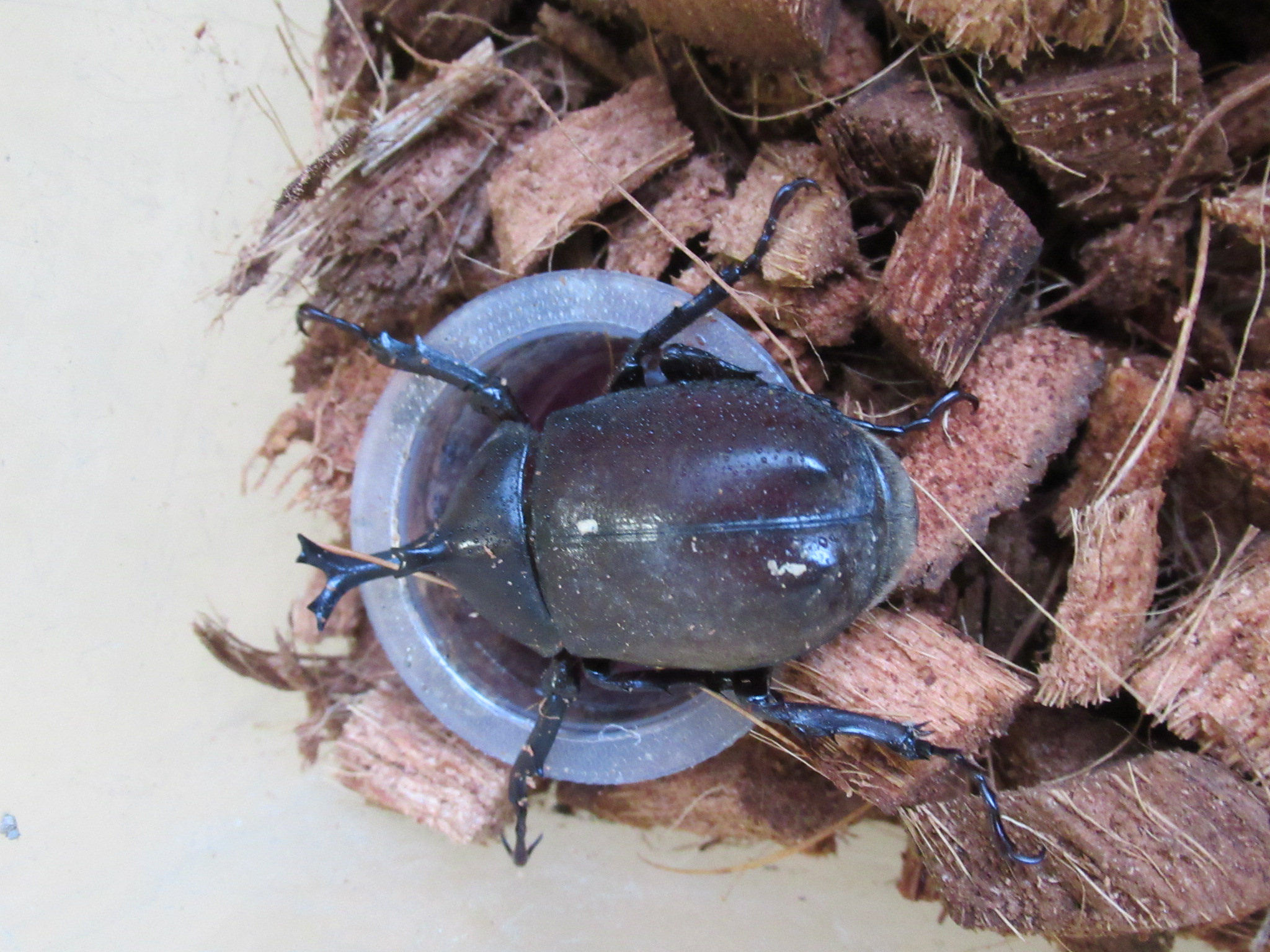 とってもくいしんぼうなカブトムシで昆虫ゼリーに頭をつっこんで夢中で食べています。