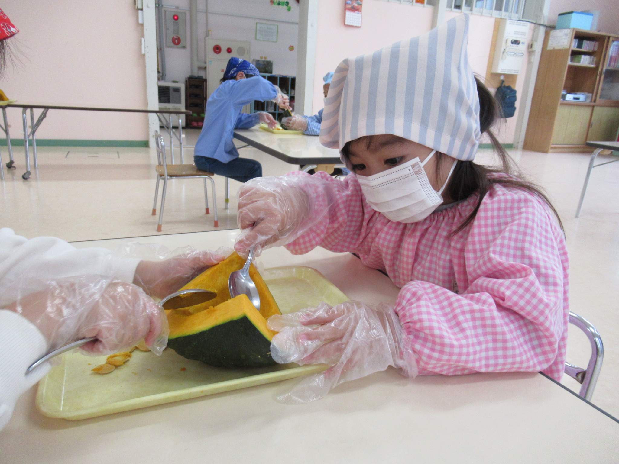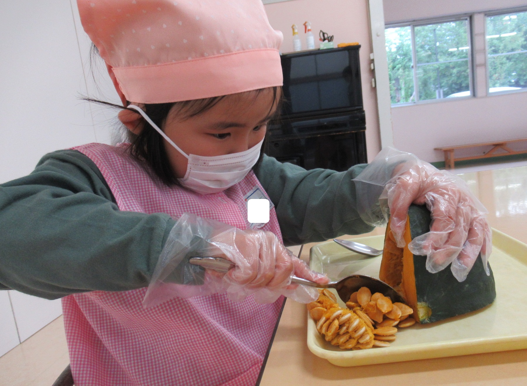 キッズカフェでは、ハッピー畑で収穫したかぼちゃを使って「ハッピー畑のかぼちゃプリン」を作り、販売しましたよ。かぼちゃの種をとる作業は子ども達がお手伝い!